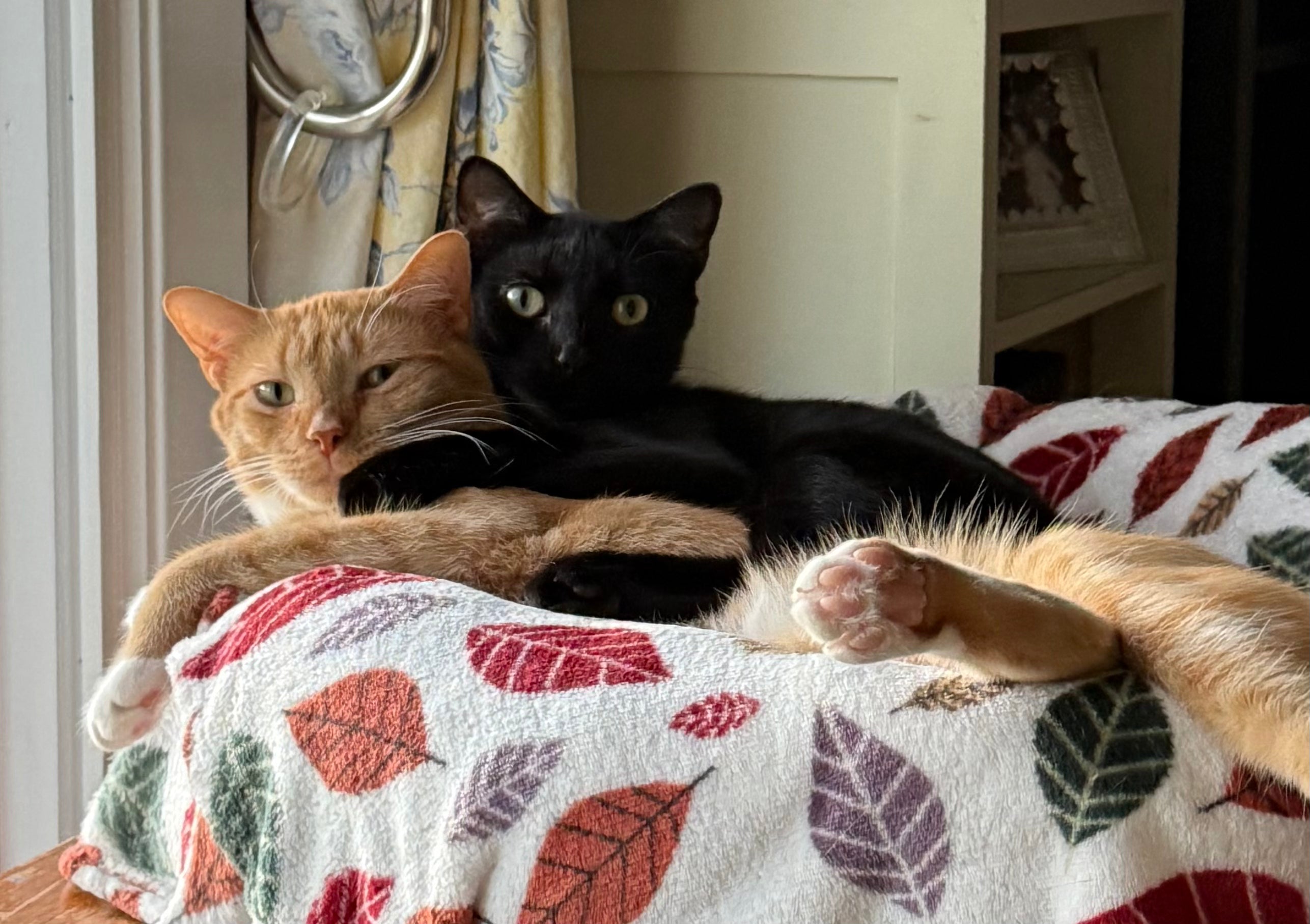 2-year-olds Archie and Eclipse enjoy chasing feathers and each other. Their tails perk straight up when you make breakfast and they give lots of eye kisses while you feed them tube treats. The boys love other cats almost as much as they love each other and would do well in a home where they can continue improving their socialization skills.