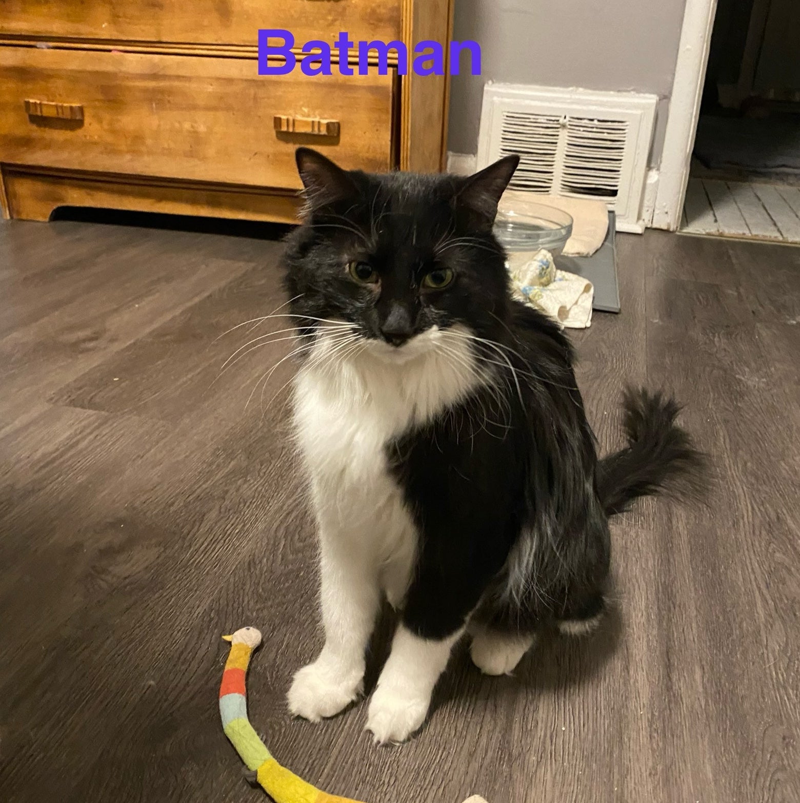 Batman is a very affectionate cat who adores his human and will show you with lots of head bumps and kisses.